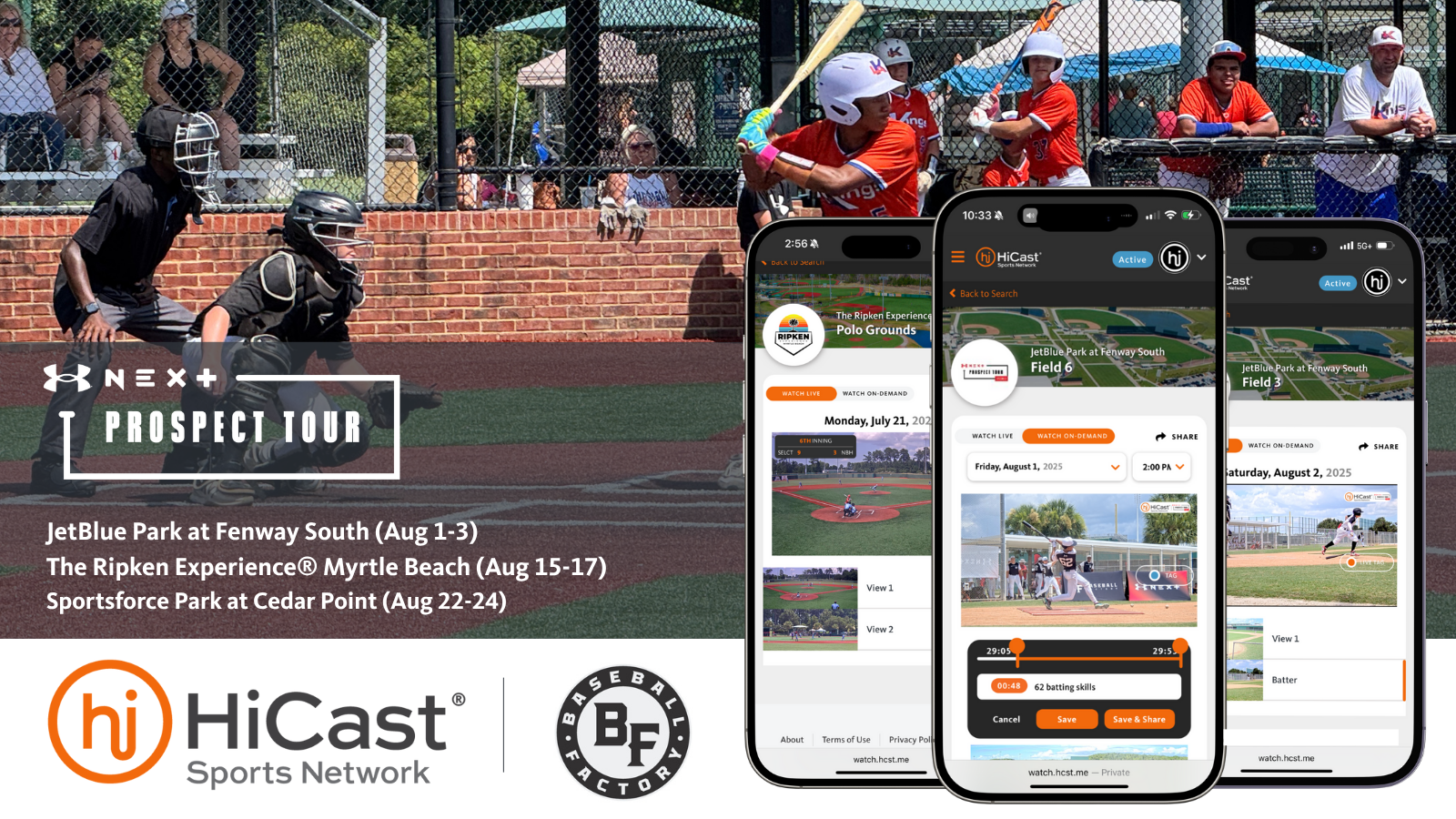 HiCast also supports the Baseball Factory and Ripken Baseball with delivery of digital video ads promoting the UA Next Prospect Tour across Ripken Baseball venues covered in the HiCast Sports Network. This cross-marketing approach fuels player nominations and event visibility, helping athletes and their families discover new opportunities for development and exposure.